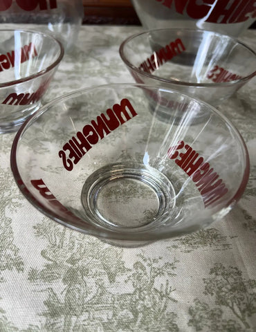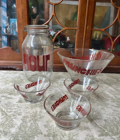 1970s Collection of Red Font Munchies Bowls and Flour Jar- Set of 5