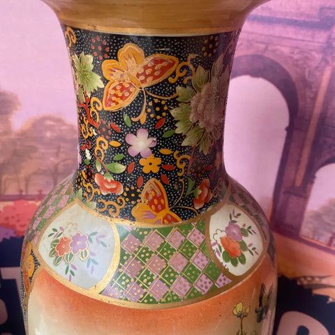 A beautiful large satsuma style vase. This piece has detailed hand painted designs all over it. Perfect for the interior designer or the enthusiast!