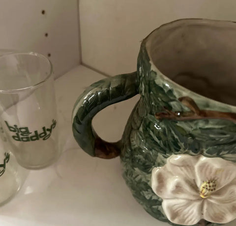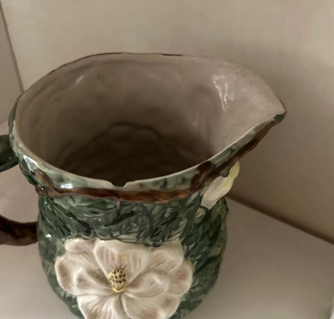 1970s Mid-Century Ceramic Green Pitcher With White Flower Accents