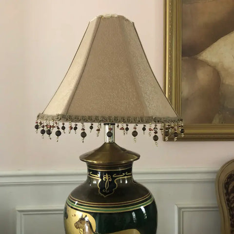 Gorgeous chinoiserie table lamp with equestrian horse Details. Beautiful shine to it and a great addition to any space.