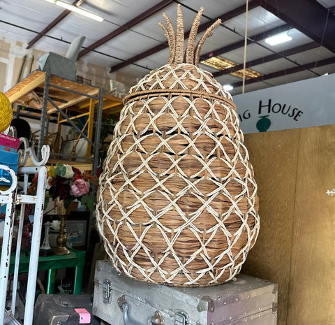 Up for consideration is a beautiful vintage oversized wicker pineapple boho chic basket with matching lid. This would look lovely in your home and is a perfect storage idea. This is also a great find for the interior design enthusiast. Please check out my other listings!