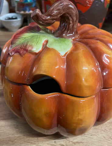 Up for consideration is a beautiful vintage ceramic serving pumpkin bowl with a matching lid. This would look lovely in your home and it is a great conversation starter for your guests. This piece is also perfect for the interior design enthusiast. Please check out my other listings!