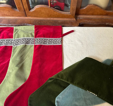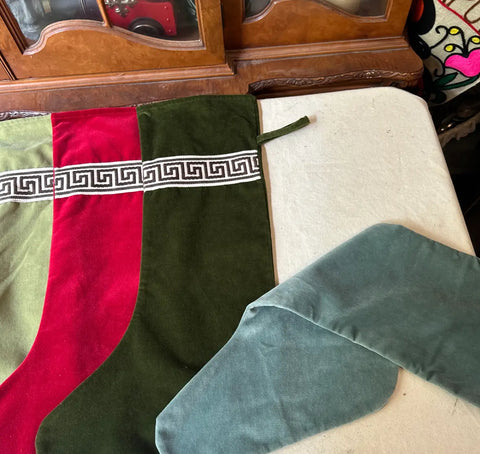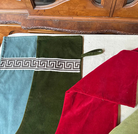 Up for consideration is a beautiful collection of velvet colorful Christmas stockings with Greek key accents. These would look lovely hung across your mantel or over the fireplace. These are also a great find for the interior design enthusiast. Please check out my other listings!