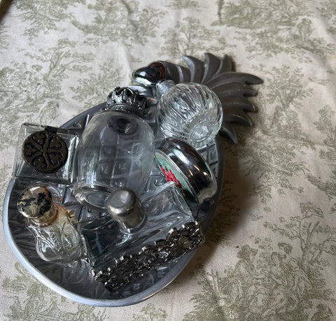 Up for consideration is a beautiful vintage collection of glass and silver perfume bottles. These would look lovely in your home as a set or spread throughout your home. These are also a great find for the interior design enthusiast. Please check out my other listings!