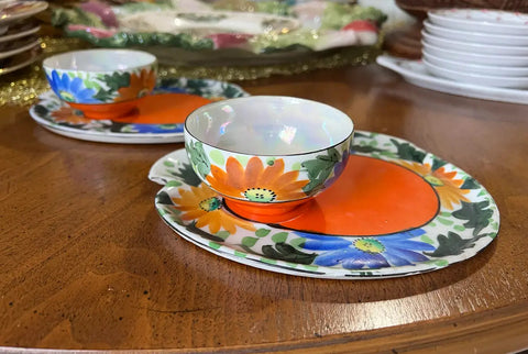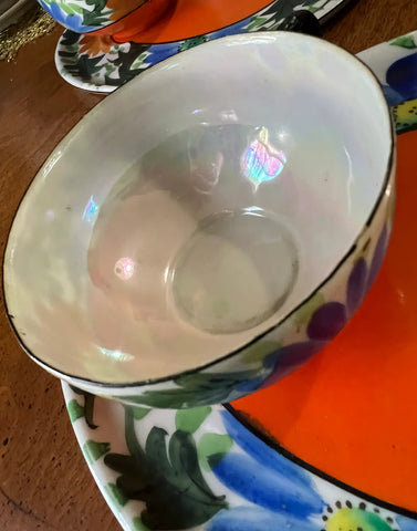 Pair of Orange and Blue Ceramic Plates and Teacups