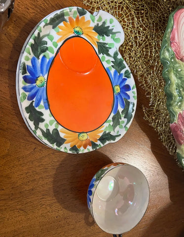 Up for consideration is a beautiful vintage pair of orange and blue plates and teacups. These would look lovely in your home and they are a great conversation starter for your guests. These are also perfect for the interior design enthusiast. Please check out my other listings!