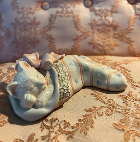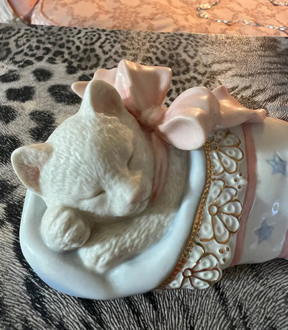 Small Vintage Lennox Christmas Cat Sleeping in Stocking Knick Knack
