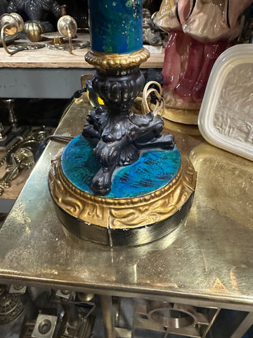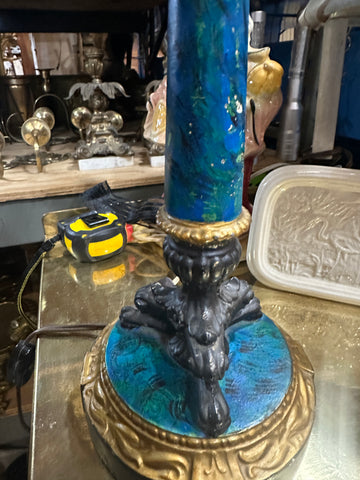 Vintage Bright Blue Table Lamp with Gold Leaf and Lions Foot Accents