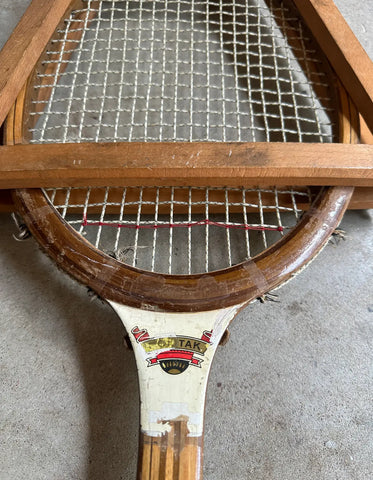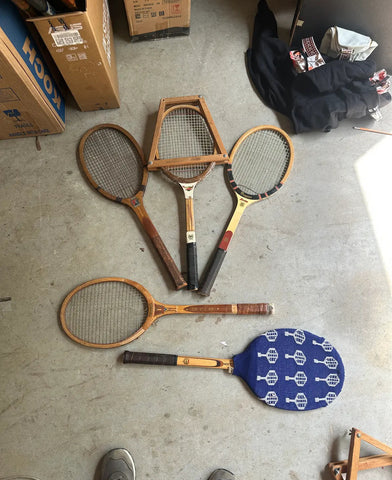 Vintage Collection of Miscellaneous Tennis Rackets With Guard and Hand Knit Cover