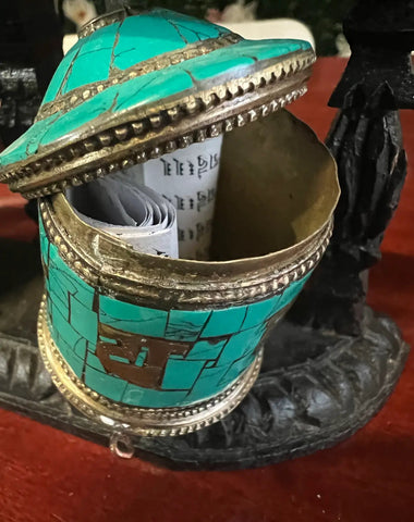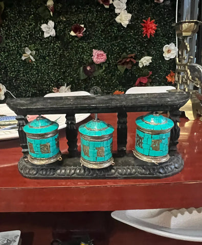 Vintage Tibetan Wall Hanging Teal and Black Prayer Wheel