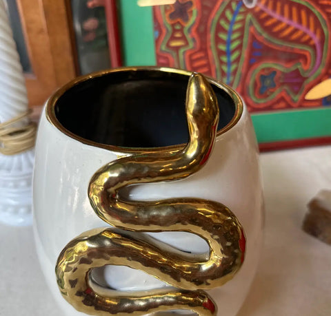 Up for consideration is a beautiful vintage white ceramic vase or planter with gold snake accents. This is a lovely piece that is a perfect conversation starter for your guests. This is an also a great find for the interior design enthusiast. Please check out my other listings!